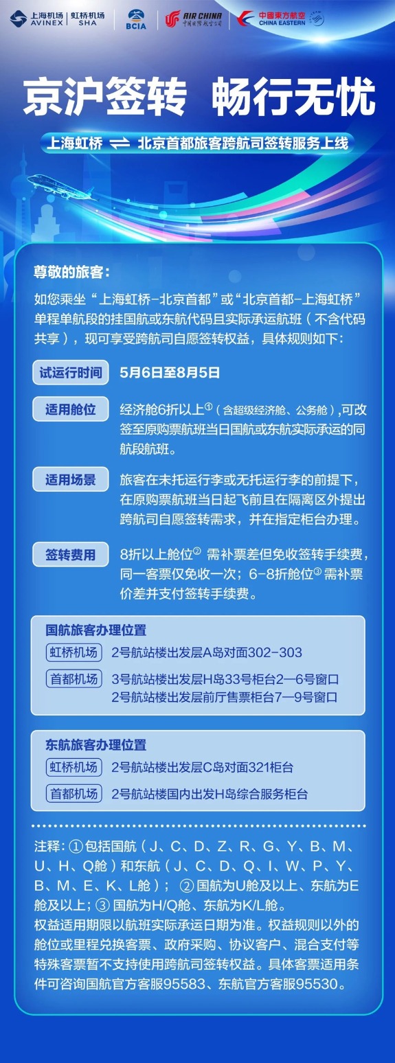 5月6日,为进一步优化航空快线服务品质,有序推进航司间自由签转,虹桥机场联合东航、国航试行推出往返上海虹桥和北京首都机场的快线跨航司自愿签转服务。试运行计划持续至8月份,后续将根据旅客反馈对该服务进行进一步拓展升级。